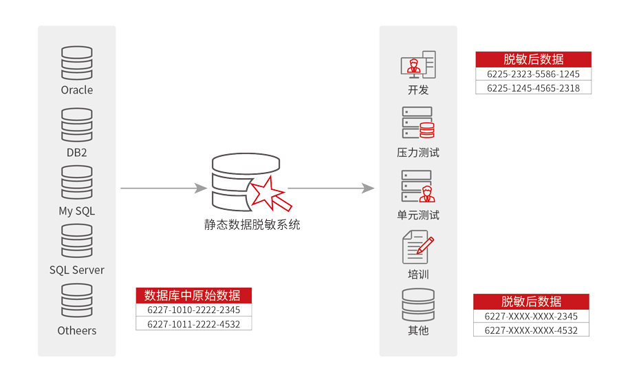 靜(jìng)态數(shù)據脫敏系統支持當前主流數(shù)據庫與文(wén)件(jiàn)作(zuò)為(wèi)脫敏數(shù)據源,數(shù)據庫包括Oracle、MySQ•L、SQL Server、DB2等,文(wén)件(jiàn)格式包括CSV文(wén)件(jiàn)、Dump文(wén)件(jiàn)、TXT文(wén)±件(jiàn)等。本系統無需應用(yòng)、網絡環境改造的(de)前提下(xià),提供可(kě)靠數(shù)據脫>敏服務。